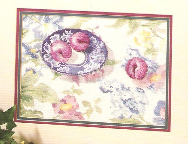 This is an out of production cross stitch chart of the pictured designs entitled "Peaches & Plums" by Maria Winkler from Color Charts. The stitch counts are 147 x 103.